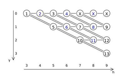 | Keywords: Tie diagram knot classes.svg Classification of necktie knots according to Fink/Mao <br> horizontal line L-R or R-L move<br> diagonal line L-C-R or R-C-L or R-C-R or L-C-L move<br> X non-aesthetical knots<br> blue even size seam towards neck <br> <math>\gamma</math> number of C moves<br> <math>h</math> size XY plots Language-neutral diagrams |