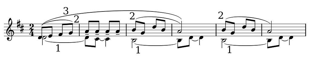 Keywords: Ties slurs and ligature.svg Sample notation of 1 ties 2 slurs and 3 ligatures Beispiel für 1 Halte- 2 Binde- und 3 Phrasierungsbögen tune Public domain children's song Fuchs du hast die Gans gestohlen author Ernst Anschütz 1780 1861 ; File self-created using Lilypond by FordPrefect42 SVG by Ysangkok 01-07-2007 User Ysangkok Original by User FordPrefect42 Image Ties slurs and ligature png LilyPond source <pre><nowiki> \key d \major \time 2/4 << \phrasingSlurUp \slurUp d'8 \ e' fis' g' a'_- a'_- a'_- a'_- b' g' d b' a'2 \ b'8 g' d b' a'2 \\ d'2~ d'8 cis'~ cis'4 b2~ b8 d'8~ d'4 b2~ b8 d'8~ d'4 >> </nowiki></pre> Source User FordPrefect42 Tie music Images with LilyPond source code Slurs |