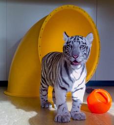Keywords: tiger cub white baby cat feline fur toys indoors zoo wildlife animal nature portrait stripes creature looking