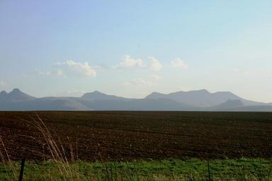 Keywords: tilled land brown soil soil green grass tuft of tall wavy grass blue mountains sky clouds