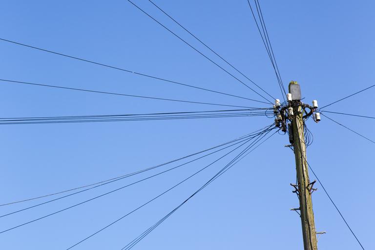 Keywords: timber telegraph pole old ceramic isolators old step irons overhead cables blue sky