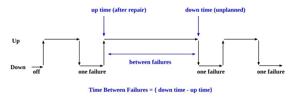 Keywords: Time between failures.svg en To explain the background of MTBF calculation Own work by uploader based on Andjohn2000 Time_between_failures jpg Ferdna Andjohn2000 10/06/2008 Systems engineering Safety