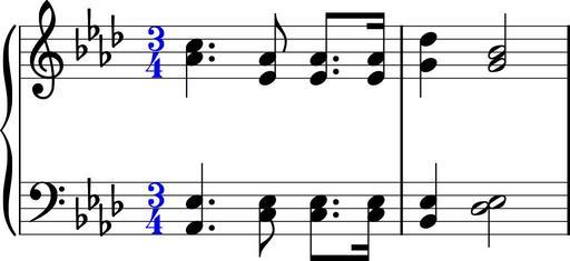 | Keywords: Time signature example.svg An example time signature The music is the opening of Ludwig van Beethoven's Piano Sonata No 31 Image generated from the following LilyPond file <pre> \version 2 8 0 \layout ragged-right t \new PianoStaff << \new Staff \time 3/4 \clef treble \key aes \major < c aes' > 4 < aes' ees' > 8 < aes' ees' > 8 < aes' ees' > 16 < des g' > 4 < bes' g' > 2 \new Staff \clef bass \key aes \major < ees aes > 4 < ees c > 8 < ees c > 8 < ees c > 16 < ees bes > 4 < ees des > 2 >> </pre> own Wereon Time signatures |