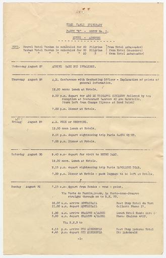 | Keywords: meuse-argonne american cemetery and memorial meuseargonneamericancemeteryandmemorial american war mothers americanwarmothers american gold star mothers, inc. americangoldstarmothersinc travel world war i worldwari world war one worldwarone world war 1 worldwar1 wwi ww1 great war greatwar first world war firstworldwar 1st world war 1stworldwar world war, 1914-1918 worldwar19141918 text document writing Title: Time Table Itinerary, Party 'R' - Group No. I; Meuse - Argonne Creator: American Gold Star Mothers, Inc. Date: August 1930 Part Of: Horn family papers Place: Paris, France Description: One of four typewritten sheets providing a detailed itinerary for visiting the Meuse-Argonne cemetery. This item is from the Horn Family Papers collection, which contains the family papers of Thomas Lora Horn, his wife Blanche, and their two sons in St. Louis, Missouri. Their son Leslie, a second lieutenant in the 110th infantry, 28th division, lost his life on October 1, 1918 at the Battle of Argonne during World War I. This collection includes materials regarding Leslie's death and Blanche's visit to his grave at Meuse-Argonne American Cemetery in 1930 as part of the Gold Star Mothers and Widows Pilgrimage. Physical Description: 4 sheets (4 pages): typescript on paper; 33 x 21 cm File: a2010_0029c_7_2_opt.pdf Rights: This item may be protected by copyright law. Please cite the DeGolyer Library, Southern Methodist University as the source of this file. For more information contact degolyer@smu.edu. For more information, see: digitalcollections.smu.edu/cdm/ref/collection/dgl/id/602 View the Horn family papers: digitalcollections.smu.edu/cdm/search/collection/dgl/sear... View DeGolyer Library: Photographs, Manuscripts, and Imprints: digitalcollections.smu.edu/all/cul/dgl/ Title: Time Table Itinerary, Party 'R' - Group No. I; Meuse - Argonne Creator: American Gold Star Mothers, Inc. Date: August 1930 Part Of: Horn family papers Place: Paris, France Description: One of four typewritten sheets providing a detailed itinerary for visiting the Meuse-Argonne cemetery. This item is from the Horn Family Papers collection, which contains the family papers of Thomas Lora Horn, his wife Blanche, and their two sons in St. Louis, Missouri. Their son Leslie, a second lieutenant in the 110th infantry, 28th division, lost his life on October 1, 1918 at the Battle of Argonne during World War I. This collection includes materials regarding Leslie's death and Blanche's visit to his grave at Meuse-Argonne American Cemetery in 1930 as part of the Gold Star Mothers and Widows Pilgrimage. Physical Description: 4 sheets (4 pages): typescript on paper; 33 x 21 cm File: a2010_0029c_7_2_opt.pdf Rights: This item may be protected by copyright law. Please cite the DeGolyer Library, Southern Methodist University as the source of this file. For more information contact degolyer@smu.edu. For more information, see: digitalcollections.smu.edu/cdm/ref/collection/dgl/id/602 View the Horn family papers: digitalcollections.smu.edu/cdm/search/collection/dgl/sear... View DeGolyer Library: Photographs, Manuscripts, and Imprints: digitalcollections.smu.edu/all/cul/dgl/ |