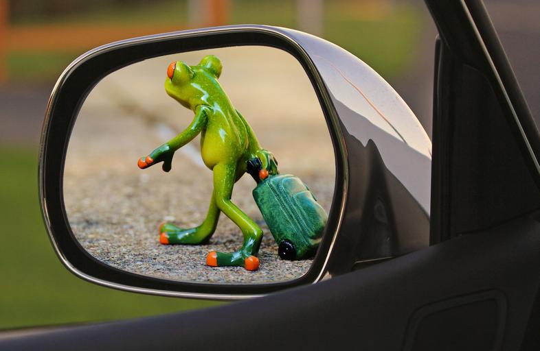 Keywords: time to go frog farewell sad luggage trolley funny cute rear mirror drive away leave