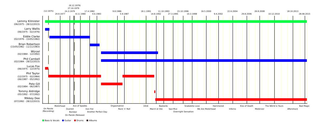 Keywords: Timeline - Motörhead.svg Inkscape en Timeline of the rock band Motörhead Lineups and albums Range 1 1 1975 - 1 1 2016 Album release coordinates Days 1 1 1975 to release date / 10 Until Rock 'n' Roll 1987 Release date Chart entry de Zeitleiste der Rockband Motörhead Bandbesetzungen und Alben Bereich 1 1 1975 - 1 1 2016 Album Release Koordinaten Tage 1 1 1975 bis Release Datum / 10 Bis Rock 'n' Roll 1987 Release Datum Chart Einstieg own Roland Lehner 2011-01-07 Timelines of musical groups Motörhead Cc-zero |