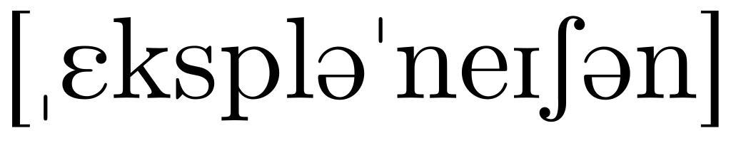 | Keywords: Tipa explanation.svg The word 'explanation' in the International Phonetic Alphabet IPA I made this image using tipa by Jonsafari Das Wort žexplanation Erklärung in IPA-Zeichen erzeugt mit TIPA Original source Tipa explanation png; SVG self created using pdfeTeX from LaTeX source see below 2009-04-29 Original author Jonsafari; SVG from Lumu <span class signature-talk >talk</span> LaTeX Source <source lang latex > \documentclass article \usepackage tipa \begin document \textipa Ekspl neIS n \end document </source> Original en English Wikipedia Jonsafari SVG convert TeX Phonetics Images with LaTeX source code |