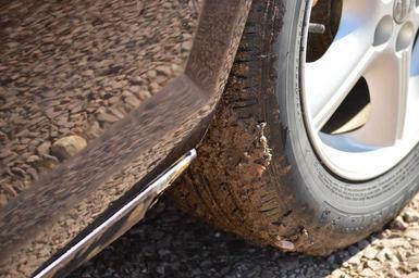 Keywords: tire dirty clean wheel rubber black vehicle track road dirt car parked washed cleaned shiny off-road driving automobile rocks mud
