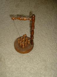 Keywords: Tischkegel 012.jpg de Einfaches Tischkegelspiel gedrechseltes Holz an der Seite Ziehknopf zum Aufstellen der Kegel own own Bowling Children's games Physical-skill games Skittles game