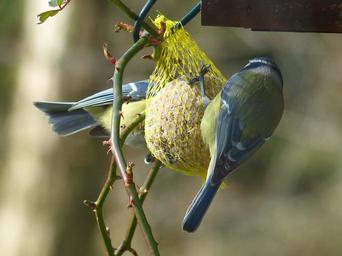 Keywords: tit blue tit cyanistes caeruleus parus caeruleus paridae small bird bird animal eat peck depend claws out fat balls food bird seed feed network hang winter rosebush