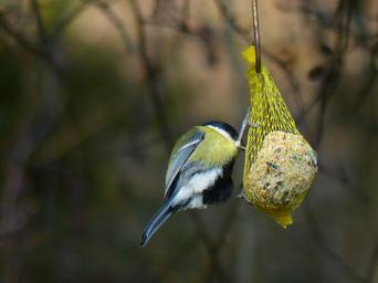 Keywords: tit parus major paridae passeri songbird bird sparrow bird animal eat peck depend claws out fat balls food bird seed feed network hang winter
