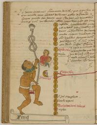 | Keywords: Tititl, the 17th Month of the Aztec Solar Calendar WDL6707.png Artwork ru Това Хуан де около 1546 г около 1626 г fr Tovar Jean de 1546-1626 env en Tovar Juan de circa 1546-circa 1626 zh 胡安·德·托瓦尔,约 1546 年 - 约 1626 年 pt Tovar Juan de por volta de 1546-por volta de 1626 ar خوان دو توفار، حوالي 1546-حوالي 1626 es Tovar Juan de circa 1546-circa 1626 ru Тититль 17-й месяц солнечного календа я ацтеков fr Tititl 17e mois du calendrier solaire aztèque en Tititl the 17th Month of the Aztec Solar Calendar zh 阿兹特克太阳历的第 17 个 伸展 pt Tititl o 17º mês do calendário solar asteca ar تِتِتْلْ، الشهر السابع عشر من التقويم الشمسي الأزتكي ru Кодекс Това а авто ом кото ого считается мексиканский иезуит XVI века Хуан де Това соде жит под обную инфо мацию об об ядах и це емониях ацтеков известных также как мешика Кодекс п оиллюст и ован 51 аква ельным исунком на полную ст аницу Рисунки в кото ых наблюдается значительное влияние пиктог афических укописей доколониальных в емен обладают исключительными художественными достоинствами Рукопись состоит из т ех азделов В пе вом азделе описана исто ия путешествий ацтеков до п ибытия испанцев Вто ой аздел п едставляет собой иллюст и ованную исто ию ацтеков В т етьем азделе находится календа ь Това а в кото ом п ослеживается календа ный цикл ацтеков с месяцами неделями днями воск есными буквами и елигиозными п аздниками х истианского 365-дневного года а этой иллюст ации из т етьего аздела изоб ажен мужчина баланси ующий на ве тикальном канате с восьме кой на ве хнем конце а шее у него надето двойное оже елье из синих бусин с золотыми колокольчиками ад его головой асположен мужчина выливающий воду из сосуда В тексте описано как боги астягивают и подде живают машину ми а чтобы ее не аз ушила ужасная сила вет ов Этот месяц оп еделяемый как янва ь называется астягивание Из известных комментато ов календа я ацтеков только Това описывает этот месяц как символ эне гии космоса Этот месяц часто связывают с об ядами ткачей кото ым пок овительствовала богиня Иламатекутли <br>Календа ь ацтеков; Боги ацтеков; ифология ацтеков; Ацтеки; Календа и; Кодекс; Индейцы ексики; Ко енные на одности; езоаме ика; Кодекс Това а fr Le codex Tovar attribué à Jean de Tovar jésuite mexicain du XVI<sup>e</sup> siècle contient des informations détaillées sur les rites et les cérémonies des Aztèques également connus sous le nom de Mexicas Il est illustré de 51 aquarelles de la taille d'une page Fortement influencées par les manuscrits pictographiques de la période précontact ces peintures sont d'une qualité artistique exceptionnelle Le manuscrit est divisé en trois sections La première section contient une histoire des voyages des Aztèques avant l'arrivée des Espagnols La deuxième section est une histoire illustrée des Aztèques Dans la troisième section le calendrier de Tovar transcrit un calendrier aztèque continu avec les mois les semaines les jours les lettres dominicales et les fêtes liturgiques d'une année chrétienne de 365 jours Cette illustration extraite de la troisième section représente un homme portant un collier de perles bleues à double rang orné de clochettes dorées se balançant sur une corde verticale dont l'extrémité forme le chiffre huit Au-dessus de lui un homme versant l'eau d'un récipient est dessiné Le texte décrit comment les dieux étirent et sustentent la machine du monde de sorte que la grande violence des vents ne la détruise pas Ce mois assimilé à janvier est appelé Tititl et signifie étirement Parmi les commentateurs connus du calendrier aztèque seul Tovar le décrit comme étant le symbole d'un cosmos dynamique Ce mois est souvent associé aux rites des tisserands dont la déesse protectrice était Ilamatecuhtli <br>Calendrier aztèque; Dieux aztèques; Mythologie aztèque; Aztèques; Calendriers; Codex; Indiens du Mexique; Peuples autochtones; Méso-Amérique; Codex Tovar en The Tovar Codex attributed to the 16th-century Mexican Jesuit Juan de Tovar contains detailed information about the rites and ceremonies of the Aztecs also known as Mexica The codex is illustrated with 51 full-page paintings in watercolor Strongly influenced by pre-contact pictographic manuscripts the paintings are of exceptional artistic quality The manuscript is divided into three sections The first section is a history of the travels of the Aztecs prior to the arrival of the Spanish The second section is an illustrated history of the Aztecs The third section contains the Tovar calendar which records a continuous Aztec calendar with months weeks days 