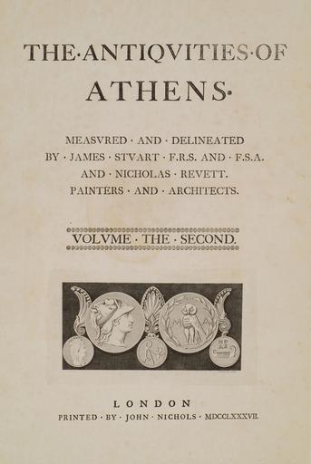 | Keywords: Title page of the second volume of the book Medallions of three Athenian demes- Marathon, Rhamnous and Prasiai - Stuart James & Revett Nicholas - 1787.jpg en James Stuart Nicholas Revett The Antiquities of Athens measured and delineated by James Stuart F R S and F S A and Nicholas Revett Painters and Αrchitects vol III ed Willey Reveley London John Nichols 1794 1794 http //eng travelogues gr/collection php view 174 Creator James Stuart Creator Nicholas Revett other versions Custom license marker 2016 04 06 PD-old PD-1996 The Antiquities of Athens measured and delineated |