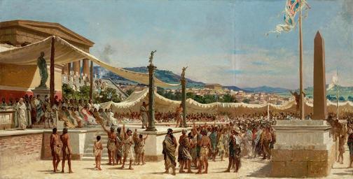 | Keywords: Tito Quinto da la Liberta ai greci - Giuseppe Sciuti.jpg it Tito Quinto da la Liberta ai greci Titus Quinctius offers the liberty to the Greeks Oil on canvas 83 x 195 cm 1879 http //www dorotheum com/blog/sicilian-heritage-sciuti-giuseppe/ Dorotheum Creator Giuseppe Sciuti other versions PD-old-100 Giuseppe Sciuti Titus Quinctius Flamininus Obelisks in art | ||||