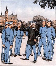 | Keywords: Tjenestelaesning.jpg en Service Reading <br> <I> sergeant </I> Why do a Field Bottle to Soldier Field luggage <br> <I> first Recruitment </I> for him to take a dram with <br> <I> sergeant </I> Nonsense The next one <br> <I> second Recruitment </I> For he can have something to drink on Mars Chen <br> <I> sergeant </I> Nonsense The next one <br> <I> third Recruitment </I> Field Bottle serves for storage of spirituous and invigorating drink <br> <I> sergeant </I> No to the devil Soldier Field bears the bottle because it is <I>commanded </I> es Lectura del servicio <br> <I> sargento </I> ¿Por qué el soldaro lleva una cantimplora en su equipaje <br> <I> primer recluta </I> Para tomar aguardiente con ella <br> <I> sargento </I> ¡Tonterías ¡El que sigue <br> <I> segundo recluta </I> Con el fin de poder tener algo de beber en la marcha <br> <I> sargento </I> ¡Gilipolleces ¡El que sigue <br> <I> tercero recluta </I> La cantimplora sirve para almacenar bebidas espirituosas y vigorizantes <br> <I> sargento </I> ¡Joder ¡El soldado lleva cantimplora porque <I>yo lo ordeno</I> da Tjenestelæsning <br> <I>Sergenten </I> Hvorfor hører en Feltflaske med til Soldatens feltmæssige Oppakning <br> <I>1 Rekrut </I> For at han kan tage en Snaps med <br> <I>Sergenten </I> Vrøvl Den næste <br> <I>2 Rekrut </I> For at han kan have noget at drikke på Marschen <br> <I>Sergenten </I> Sluder Den næste <br> <I>3 Rekrut </I> Feltflaske tjener til Opbevaring af spirituøse og styrkende Drikke <br> <I>Sergenten </I> Nej for Djævlen Soldaten bærer Feltflasken fordi det er <I>befalet </I> Ravnen side 133 anonymus 1896-04-26 PD PD-Art Caricatures of soldiers Ravnen Males in art Drawings of people Soldiers 19th-century paintings of soldiers Drawings of men from Denmark Caricatures of men Male soldiers Male soldiers in art Danish soldiers in art Military life |