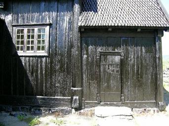 Keywords: Tjyrubredning.jpg Newly tarred wall Garmo stave church Maihaugen folk museum Lillehammer Norway Tar distilled from pinewood in a peat-coated kiln Own 2006-07-18 User Mahlum Tar Garmo stave church