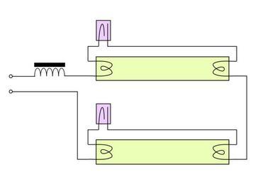 Keywords: Tl-tube-series.svg Twee TL-buizen in serieschakeling ontstoringscondensatoren weggelaten eigen werk inkscape 20070511 KoenB public domain Light-generating objects