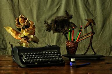 Keywords: to write machine desk flowers letters ink writing keys rose poetry antiques studio journalist communication