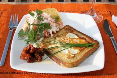 Keywords: toast toasted eggs fried egg chives crayfish relish food dining form bread sandwich bread refreshments