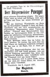 | Keywords: Todesanzeige Puvogel.jpg de Todesanzeige für Friedrich Puvogel im Wandsbecker Boten vom 5 August 1907 Verfasst von Oberbürgermeister Eduard Rauch Scan aus Wandsbek informativ - Das Buch Heinevetter-Verlag Hamburg 1994 ISBN 3-929171-51-1 Eduard Rauch 1931 1907-08-05 PD-old Bezirk Wandsbek Puvogel-Todesanzeige Politicians of Hamburg Puvogel Friedrich Death notice Hamburg Puvogel |