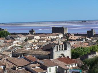 Keywords: Toits d'Aigues-Mortes.jpg Vue des toits d'Aigues Mortes Own 03/07/07 Baptiste Rossi Notre-Dame des Sablons Tiled roofs in Gard Salt evaporation ponds in Aigues-Mortes