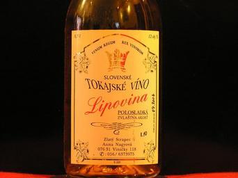 Keywords: Tokaj wine Lipovina.JPG Bottle of Tokaj wine Lipovina Semi sec author Legnaw 2004-11-01 own assumed Legnaw trademark Tokaj wines of Slovakia Wine labels