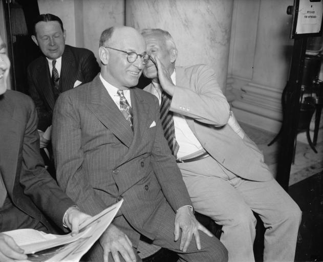 | Keywords: Tom Girdler advice 1937.jpg en Tom Mercer Girdler the president chairman and chief executive officer of Republic Steel smiles while receiving advice from Donald B Gillis vice president of Republic Steel prior to testifying before the U S Senate Committee on the Post Office on June 24 1937 1937-06-24 http //www loc gov/pictures/item/hec2009009615/ Harris Ewing Collection Library of Congress other versions PD-Harris-Ewing Tom Mercer Girdler | ||||