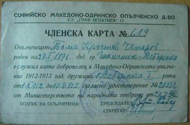 Keywords: Toma Chaparov UMAVO Member Card.JPG bg Членска ка та на софийското д ужество на Съюза на македоно-од инските опълченски д ужества на Тома К ъстев Чапа ов от Галичник photicopied UMAVO 1942 PD-old Macedonian-Adrianopolitan Volunteer Corps