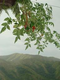 Keywords: Tomates cereza.JPG en Cherry tomatoes es Tomates cereza en una maceta colgante en el jardín de un restaurant de la Serranía del Interior Venezuela own Fev 2008-02-02 Ver Solanum lycopersicum Fruit of Venezuela