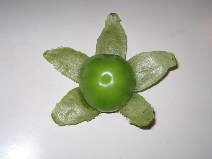 Keywords: TomatilloKitchenCounter.jpg en Ripe tomatillo partially opened Own Underpraha 2008-05-05 Physalis philadelphica