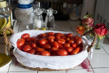 Keywords: tomato eggs tomato basket salt pepper olive oil rose kitchen tile white