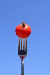 Keywords: tomato fork eat close metal fork cutlery red