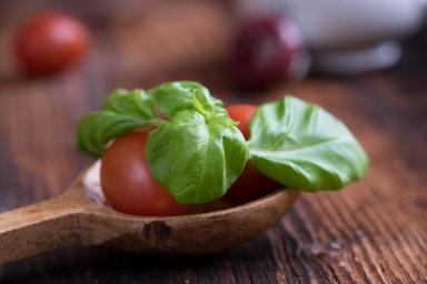 Keywords: tomatoes small tomatoes red basil green spice herbs close food-photography eat nutrition food natural product healthy delicious frisch healthy diet