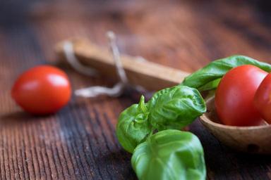 Keywords: tomatoes small tomatoes red basil green spice herbs close food-photography eat nutrition food natural product healthy delicious frisch healthy diet