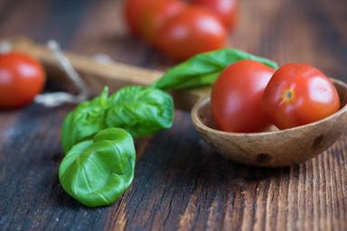 Keywords: tomatoes small tomatoes red basil green spice herbs close food-photography eat nutrition food natural product healthy delicious frisch healthy diet