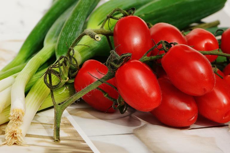 Keywords: tomatoes spring onions vegetables healthy vitamins frisch eat food bright red green bless you