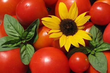 Keywords: tomatoes sunflower basil summer food vegetarian fresh organic
