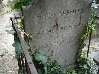 | Keywords: Tombe de Sophia ARMFIELD - Cimetière Montmartre.jpeg ARMFIELD Sophia 1778-1810 née le 5 octobre 1778 à Londres décédée le 28 août 1810 à Paris Elle est la fille de Thomas Armfield et Mary Allen mariés en 1778 à Londres Son père travaillait dans l'acier et les mécaniques textiles associé avec les Cockerill Il est venu en France pour raisons professionnelles Son père est le fondateur avec Jean-Pierre Horem de la filature de Fontaine-Daniel à Saint-Georges-Buttavent Mayenne il décède en 1829 à Loches Sophie Armfield déclare la naissance d'une fille à Paris en 1807 Élisabeth-Louise Armfield 1807-1867 elle décède en 1810 rue Saint-Claude à Paris à l'âge de 32 ans Cette fille Élizabeth-Louise Armfield épouse Martin Denis 1796-1858 chef de production à la filature de Fontaine-Daniel De cette union quatre enfants Élizabeth-Louise Armfield décède le 30 mai 1867 à Fontaine-Daniel commune de Saint-Georges-Buttavent Mayenne Sources des documents http //charlesson stefani pagesperso-orange fr/Mandres/Armfield htm le site de M Stéfani Elle est inhumée dans la 1ère division derrière la chapelle Vuillaume avenue des polonais vers le centre de la partie du cimetière entre l'avenue des polonais et le mur d'enceinte œuvre personnelle 2014-06-14 maixentais Cimetière de Montmartre Cc-zero |
