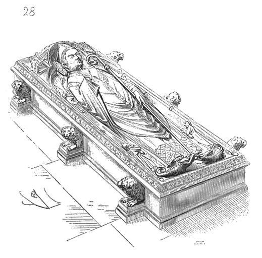 Keywords: Tombeau.cathedrale.Amiens.png Drawings by Eugène Viollet-le-Duc Nous ne possédons plus en France que quatre tombes de métal dans le genre de celle de Charles le Chauve Deux sont sans émaux ce sont les tombes des évêques d'Amiens Ewrard de Fouilloy et Godefroy; l'un de ces deux monuments est d'une grande valeur comme art c'est celui de l'évêque Ewrard La tête les draperies admirablement modelées sont d'un style excellent Nous donnons fig 28 une copie de ce tombeau Le personnage demi ronde bosse est fondu avec la plaque et la table repose sur un socle de pierre très-bas avec six lions issants L'évêque bénit et porte la crosse Deux anges thuriféraires en bas-relief encensent sa tête qui repose sur un coussin richement décoré Deux clercs également en bas-relief tiennent des flambeaux Les pieds du prélat reposent sur deux dragons Une inscription et un bel ornement courant enveloppent la igure encadrée par une sorte de dais à sa partie supérieure L'évêque Ewrard de Fouilloy fut le fondateur de la cathédrale actuelle d'Amiens commencée en 1220 Il mourut en 1223; donc son tombeau placé autrefois à l'entrée de la nef dans l'axe date de la première moitié du XIII<sup>e</sup> siècle; il possède d'ailleurs tous les caractères de cette époque Dictionnaire raisonné de l'architecture française du XI<sup>e</sup> au XI<sup>e</sup> siècle ~ 1856 Eugène Viollet le Duc Viollet-le-Duc |