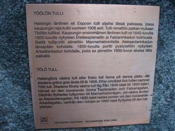 Keywords: Toolon tulli tolllbar plate.JPG Memory plate on the pillar of an ancient toll bar on Mannerheimintie Helsinki Self taken picture 2014-10-25 KLS Taka-Töölö Mannerheimintie Plaques in Finland