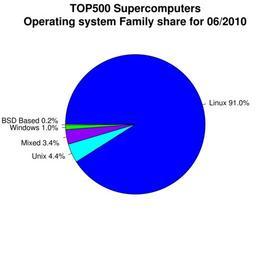 | Keywords: TOP500 operating system family share.svg en A pie chart showing the operating system family share on the TOP500 supercomputers Data from www top500 org Created using R with the following R code <pre> os title TOP500 Supercomputers Operating system Family share for 11/2009 os name c Linux 89 2 Unix 5 0 Mixed 4 6 \nWindows 1 0 BSD Based 0 2 os percent c 89 20 5 00 4 60 1 00 0 20 os color c 0000FFFF 00FFFFFF 8F00FFFF 00FF00FF FFFF00FF FF0000FF 8F8F8FFF svg pie os percent os name col os color radius 0 90 edges 720 clockwise TRUE init angle 180 main os title dev off </pre> own HeWhoMowedTheLawn 2010-03-18 This pie chart is obsoleted by File Operating_systems_used_on_top_500_supercomputers svg The TOP500 Supercomputer list is updated twice a year Operating system statistics Pie charts SVG pie charts Images with R source code |