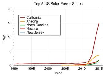 | Keywords: Top Five US Solar States.svg translate yes en Trends of solar electrical generation in the top five U S states 1990-2015 http //www eia gov/electricity/data/state/ US EIA data 2014-11-17 own Delphi234 other versions Generated with Wikimedia SVG Chart SVG Chart/box cc-zero Solar energy statistics of the United States |