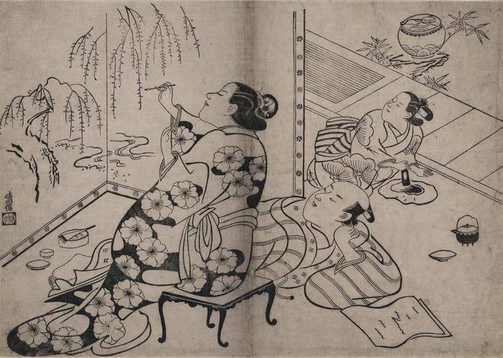 Keywords: Torii Kiyonobu - Courtesan painting a screen.jpg Courtesan painting a screen 18th century Ukiyo-e woodcut Woman painting a screen while a reclining man watches and a woman in the background mixes paint or ink Title and other information based on entry for item in exhibition catalog Exhibited The Floating world of Ukiyo-e shadows dreams and substances organized by the Library of Congress 2001 Library of Congress Prints and Photographs Division Fine Prints Japanese Pre-1915 http //hdl loc gov/loc pnp/jpd 01798 ~ 1711 Creator Torii Kiyonobu I PD LOC-image jpd 01798 Painting in art Torii Kiyonobu I PD-old-100 |
