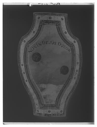 | Keywords: Tornérsköld - Livrustkammaren - 36671-negative.tif Lars Bolander sv Buren av Christopher Toll på Adolf Fredriks torg 1777 i hertig Karls kadrilj Troligen målad av hovmålare Lars Bolander efter en idé av kanslirådet Berch Konturerad sköld av förtent bleckplåt bestående av 4 hoplödda delar skölden är välvd och har en 19 mm bred något nedsänkt kantbård Målad med guld- och oljefärg Emblematiskt motiv nedåtgende sol i landskap samt måne Devis NON IN DEVà S DUCOR jag föres ej på avvägar Devisen målad i guld Kring denna bild guldbård som följer sköldens konturer Utanför denna svart kant med målade mässingsnitar Yttre kanten förgylld med målad pärlstav i brunt Sköldens baksida med tre fästpunkter för remmar De båda övre med remmar och mässingssöljor samt remmar med spännhål Nedersta bärremmen hel - nitad i vardera änden Remmarna har punsad dekor i form av en vågformig slinga utmed mittlinjen original caption Tornerspelet på Adolf Fredriks torg 1777 1777 size mm 390 615 LRK NON IN DEVà S DUCOR Johan Christoffer Toll place of origin original filename LN_E03030 62790 inventory number LRK 26132 36671 CC0 Tornérsköld - Livrustkammaren - 36671 tif |