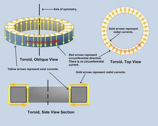 | Keywords: Toroidal Inductor-with Fully Confined Magnetic B Field, Three View.JPG Toroidal inductor with fully confined magnetic field svg A toroid shaped inductor of rectangular cross section illustrating the requirements for total confinement of the magnetic B field own Constant314 2010-10-13 Toroidal transformers Electromagnetics |