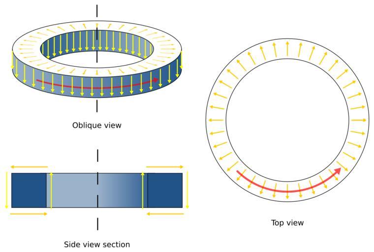 Keywords: Toroidal inductor with fully confined magnetic field.svg en A toroid shaped inductor of rectangular cross section illustrating the requirements for total confinement of the magnetic B field <br> Red arrows represent circumferential direction Yellow arrows represent axial currents Gold arrows represent radial currents 2015-06-26 own Xoneca other versions cc-zero Created with Inkscape Uploaded with UploadWizard Toroidal transformers Electromagnetics |