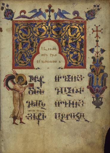 | Keywords: T'oros Roslin - Decorated Initial with Symbol of Evangelist Matthew - Google Art Project.jpg ink paint and gold on parchment Priest T'oros nephew of the catholicos Constantine I Hromkla Armenia between 1262 and 1266; Hermitage of Ark'-akaghin Cilicia Armenia 1266 mode of acquisition unknown; Ter Tiratur Sebastia Armenia 1604 mode of acquisition unknown; Church of the Holy Virgin Sebastia Armenia between 1626 and 1881 mode of acquisition unknown; Church of the Holy Cross Sebastia Armenia beween 1881 and 1915 mode of acquisition unknown; Dikran Kelekian Paris date and mode of acquisition unknown; Henry Walters New York 1929 by purchase; Sadie Jones Mrs Henry Walters New York 1931 by bequest; Walters Art Museum 1935 by bequest special url_id OQERPTGmnAH9oA PD-old-100-1923 1268 Google Art Project works by T'oros Roslin Walters MS W539 - Toros Roslin Gospels Angel of Saint Matthew in miniatures Armenian calligraphy |