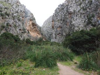 | Keywords: torrent pareis gorge riverbed dehydrated sa calobra bay of sa calobra serra de tramuntana mallorca places of interest natural wonders cliff stream bed karst erosion nature reserve natural monument dissgras grass diss ampelodesmos mauritanicus ampelodesmos ampelodesmeae poaceae green plant fouling nests true leaves away overgrown |