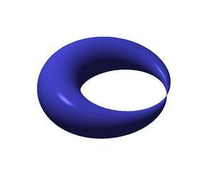 | Keywords: TorusSystole.png en A pinched torus Own work using MATLAB RobHar 2008-12-18 Data file This graphic was created in MATLAB using the following code create u-v grid space u linspace 0 2 pi 120 ; v linspace 0 2 pi 120 ; u v meshgrid u v ; R 0 5; set large radius of torus r abs cos v/2 0 2; set small radius to vary with angle parametrization x R+r cos u cos v ; y R+r cos u sin v ; z r sin u ; H surf x y z ; set H 'FaceColor' 0 25 0 25 0 75 'EdgeColor' 'none' ; set H 'SpecularColorReflectance' 0 2 'DiffuseStrength' 0 8 ; set H 'AmbientStrength' 0 3 'FaceLighting' 'phong' ; set H 'SpecularExponent' 100 ; daspect 1 1 1 ; set ratio of x y z axes axis tight; fit axes to figure axis off; don't show axes view 190 40 ; set viewing angle camlight -50 54 ; lighting phong; add light source Torus |