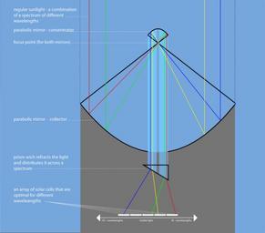 | Keywords: Total spectrum solar concentrator.png Illustration of a total spectrum solar concentrator a device used to optimise the efficiency of solar power The suns rays are first concentrated using parabolic mirrors or a fresnel lens and then spread out into a light spectrum via a prism own work 2006-06-03 Original uploader was MrMambo at http //en wikipedia org en wikipedia User MrMambo original upload log page en wikipedia Energy png 2006-06-03 10 31 MrMambo 1280×1127× 252297 bytes <nowiki>An illustration by MrMambo I declare this image to be part of the public domain </nowiki> Solar energy mirrors Concentrated solar power |